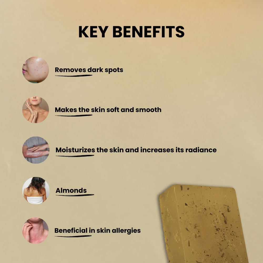 Infused with the golden power of turmeric and the richness of almonds, this 100% natural soap deeply cleanses, moisturizes, and leaves your skin soft, smooth, and radiant. The blend of chickpea flour, lemon peel, black sesame oil, and cow’s milk gently removes impurities, fights dark spots, and promotes a healthy glow — all without harsh chemicals.